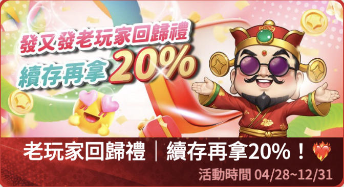 針對老玩家,發又發娛樂城也推出「續儲再拿20%」之專屬回饋,但是此項優惠相較於首儲門檻又更高,條件也更為嚴格。玩家必需: