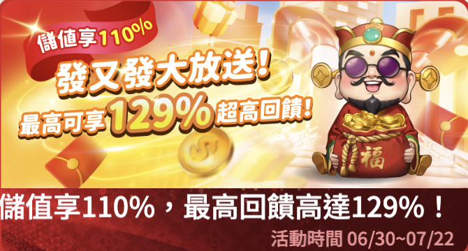 從6月底到7月下旬之限時活動,發又發娛樂城推出了號稱「最高129%回饋」之儲值方案,看似驚人,但是實際上是多重優惠組合之結果。玩家必需同時符合以下條件:
