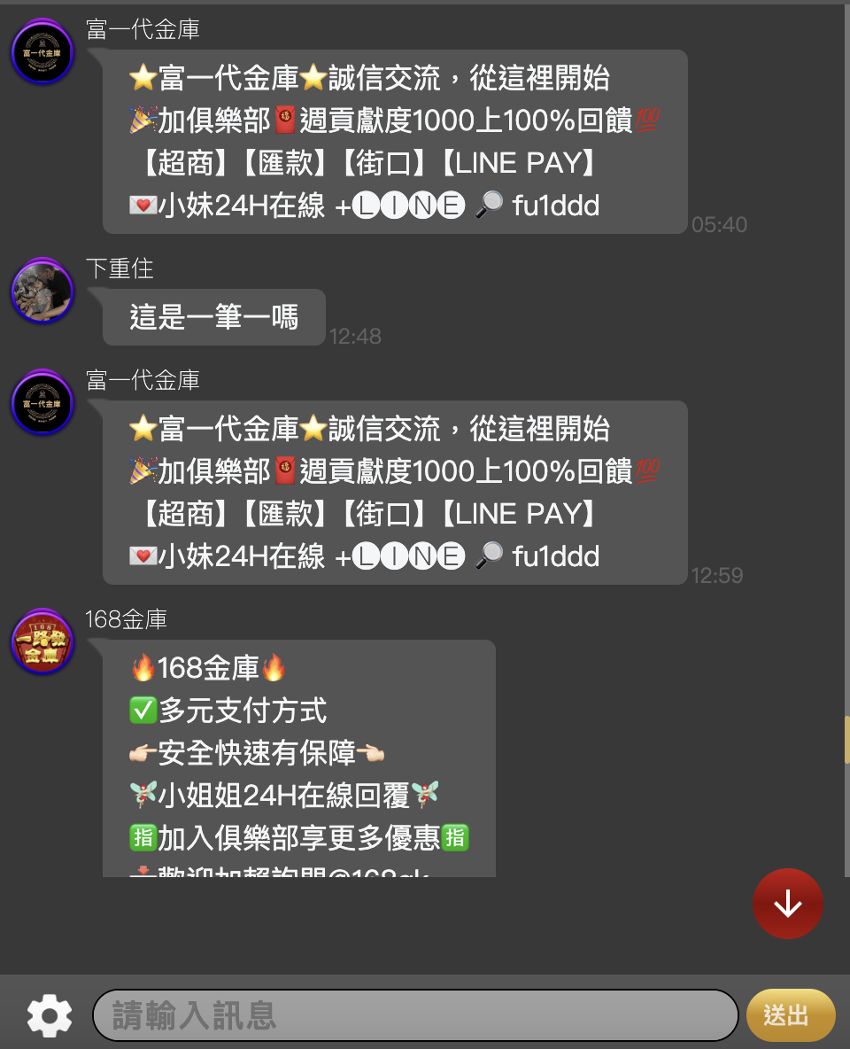 - 富一代金庫:重視誠信交流、支援多樣金流(超商、匯款、街口、LINE PAY)、標榜24小時在線,但留言多為制式廣告,實際回覆率不高。