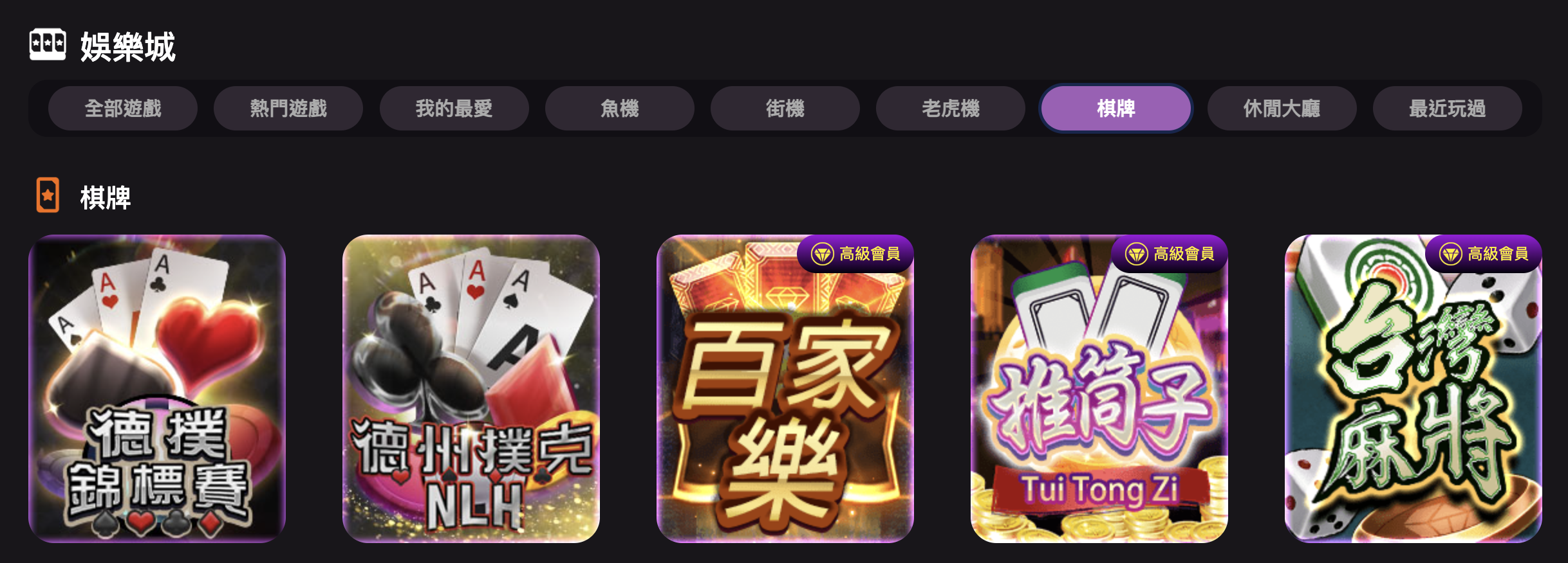 在棋牌部份,雖然「德州撲克」、「百家樂」、「台灣麻將」…等遊戲名單看似親切,但實際操作發現,多數棋牌遊戲需要達到「高級會員」等級之後才可開放。這對新手玩家來說無疑是一道門檻,也限制了他們在初期的探索彈性。就內容而言,棋牌遊戲的品質中規中矩,但尚未看到創新玩法或明顯競技機制,整體只可算是「堪用」,稱不上優質。