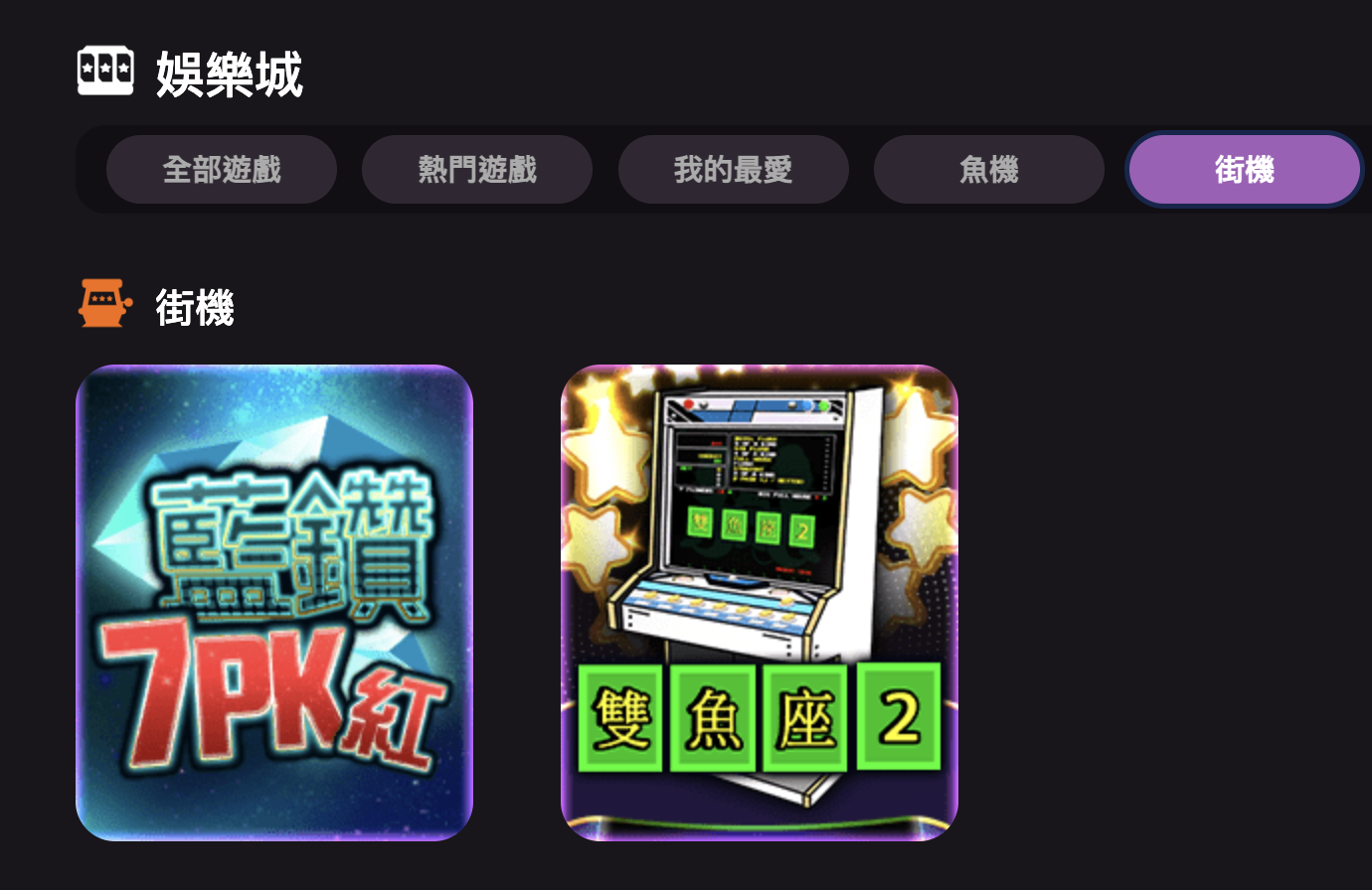 至於街機遊戲部份,平台提供了「藍鑽7PK紅」及「雙魚座2」兩款內容,不管是從遊玩方式或視覺表現上,都缺乏特色。以娛樂性跟耐玩度來說,很難讓玩家產生長期停留之動力。