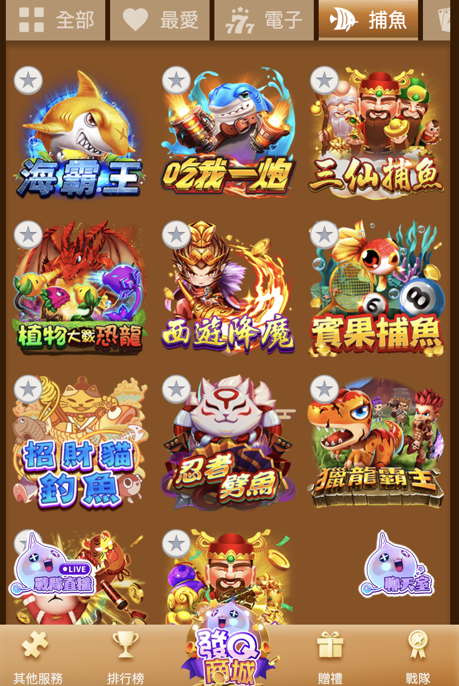 相較於老虎機的多元陣容,捕魚機在發Q娛樂城的整體配置則略顯單薄。目前只提供大約11款捕魚遊戲,包含了像是「海霸王」、「吃我一炮」、「三仙捕魚」…等市面上常見之主流捕魚機。