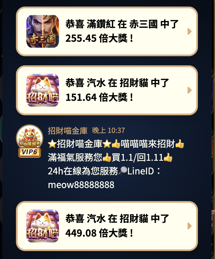 招財喵金庫時常出現在紅鑽娛樂城聊天室,打出「買1.1/回1.11」「24小時在線」…等宣傳口號,甚至留下LINE ID來當作聯絡方式。此種積極的曝光,讓部份玩家覺得它是紅鑽娛樂城幣商中少見的「固定窗口」。