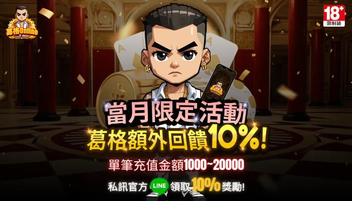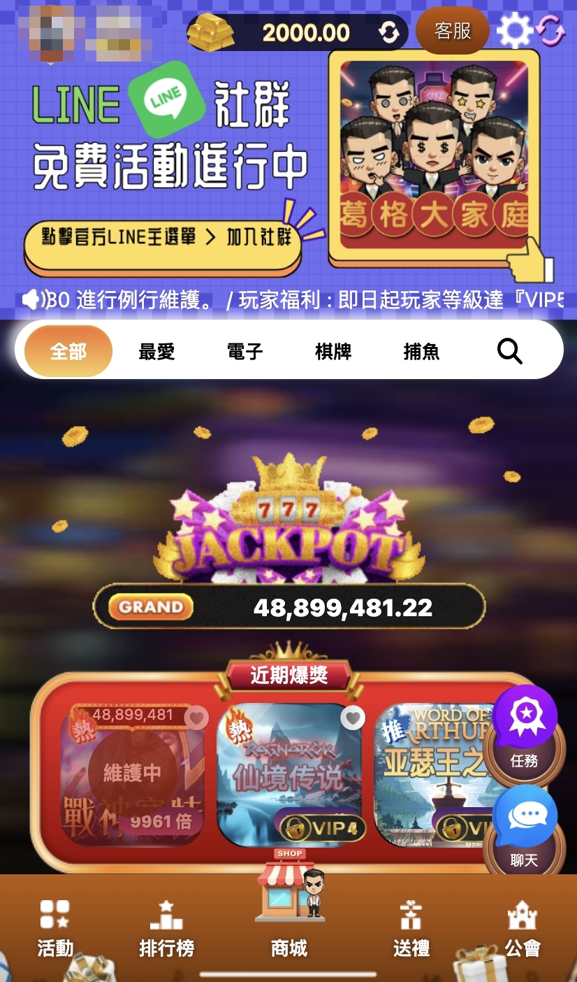 活動內容:只要加入葛格娛樂城的官方LINE帳號,就能夠獲取2000點遊戲幣。