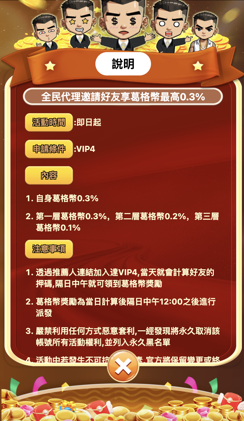 葛格娛樂城的代理制度標榜「全民皆可賺」,只要達到一定條件就能夠參加,活動內容明確列出代理分潤結構: