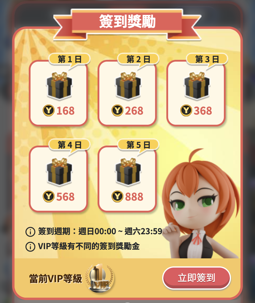- 簽到制度設計合理,從168Y幣上升到888,對小資族具備穩定回饋感。