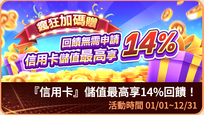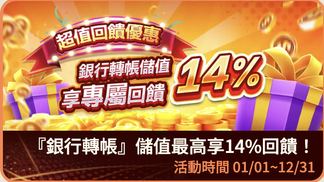 在爽爆娛樂城儲值活動中,最亮眼的莫過於信用卡及銀行轉帳專屬的14%加碼回饋。依照官網說明,玩家只要透過「商城」選擇這兩種支付方式,儲值完成後就能夠馬上得到額外遊戲點數。