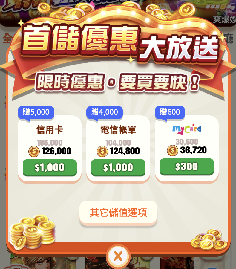 3. 挑選金額及對應方案:每一種支付方式都有對應之金額選擇,例如1,000元能夠得到126,000金幣,加贈5,000點。
